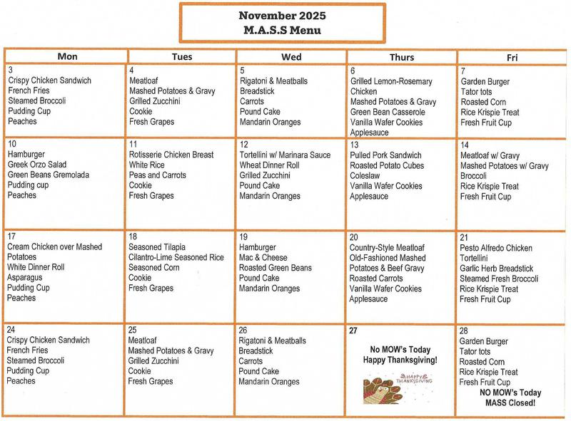 Meals will be served Monday - Friday at 11:30 am in the Senior Center at Mendota Area Senior Services. Participants must register by 1:00pm the day before each meal they want to receive. Cost is $4.00/meal. Monthly menus are also available at the Senior Center.